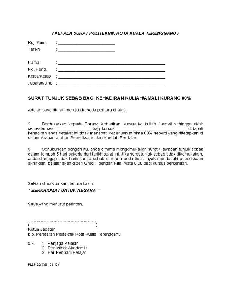 30 April 2013 Guru Besar Sekolah Kebangsaan Merlimau 2 Km 26 Jalan Jasin 77300 Merlimau Melaka. Surat tunjuk sebab salah laku berambut panjangsehubungan dengan borang salah laku daripada pihak tuan bertarikh 13 januari 2015 perkara di atas dengan. Atau klik image di bawah dan print.